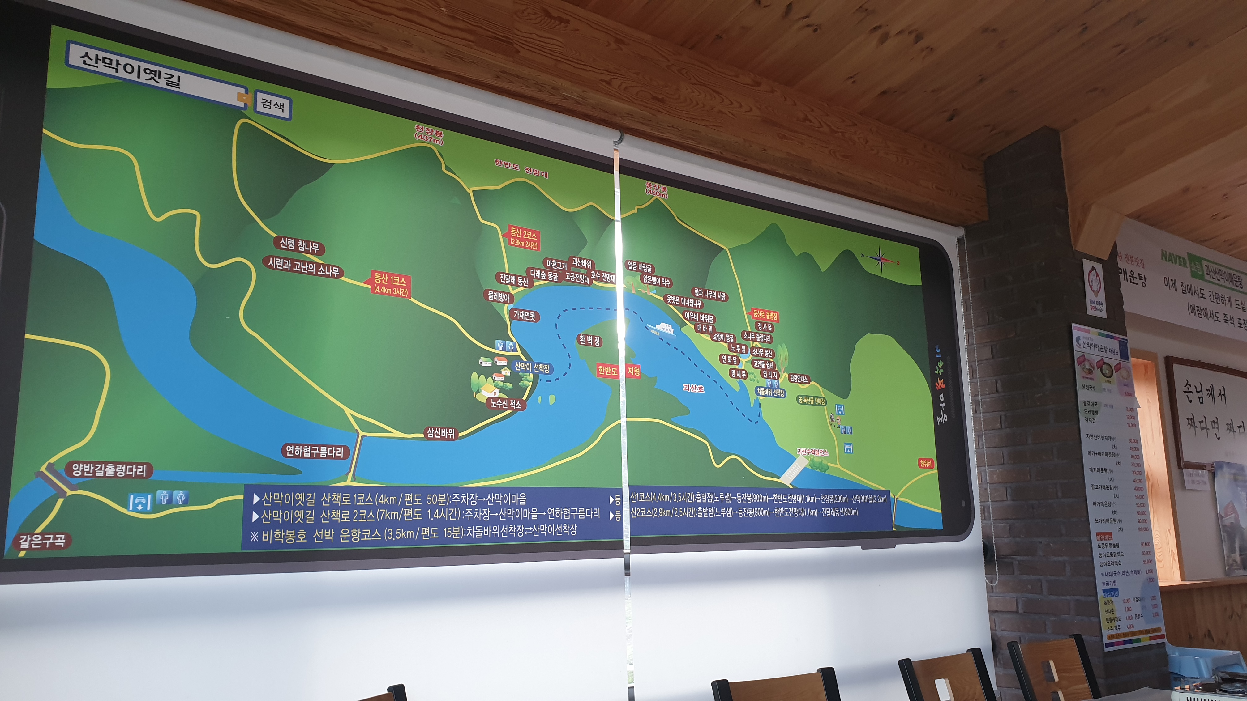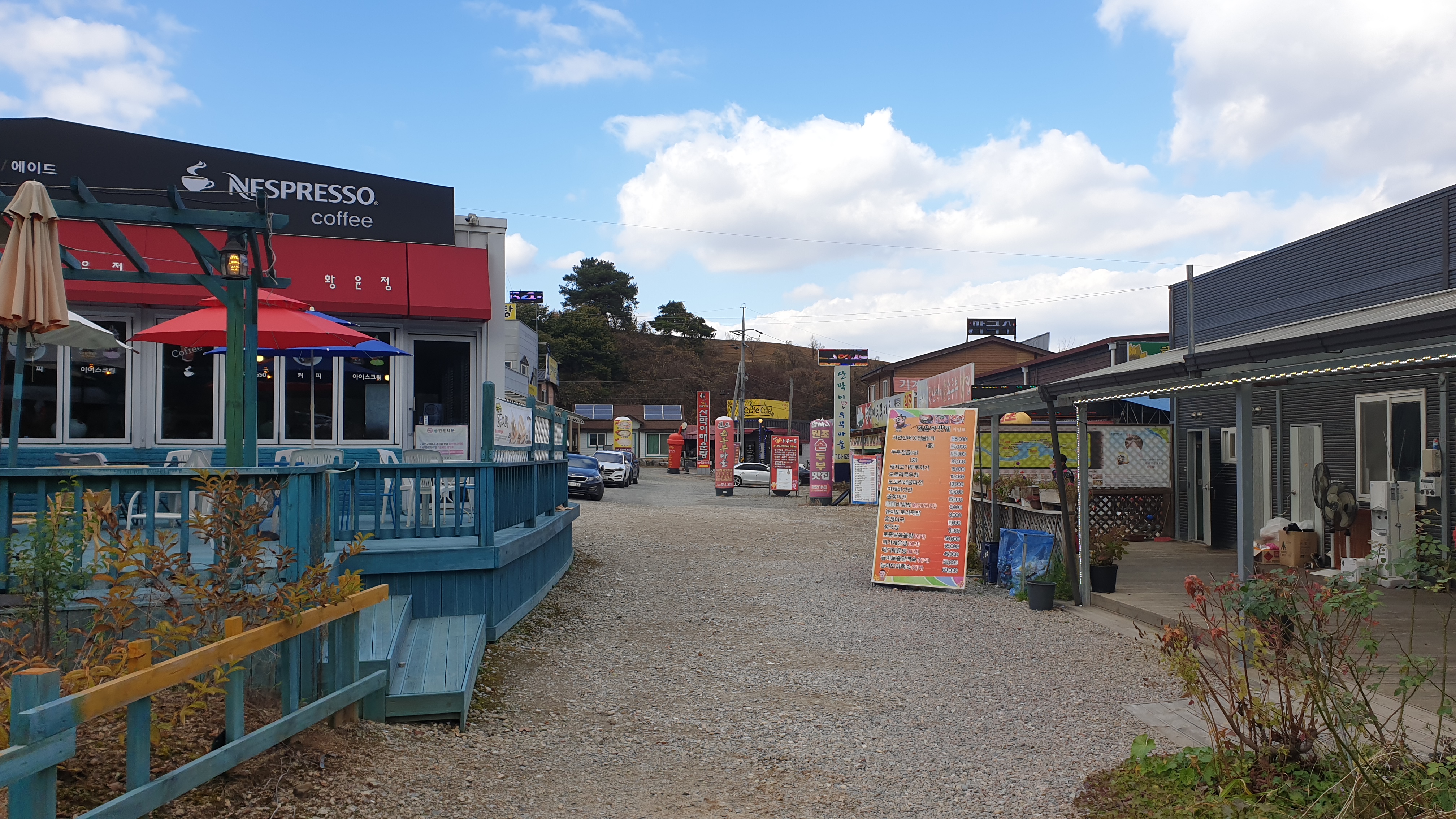 괴산 산막이옛길 주차장 위에 조성 된 식당 거리가 있어요.