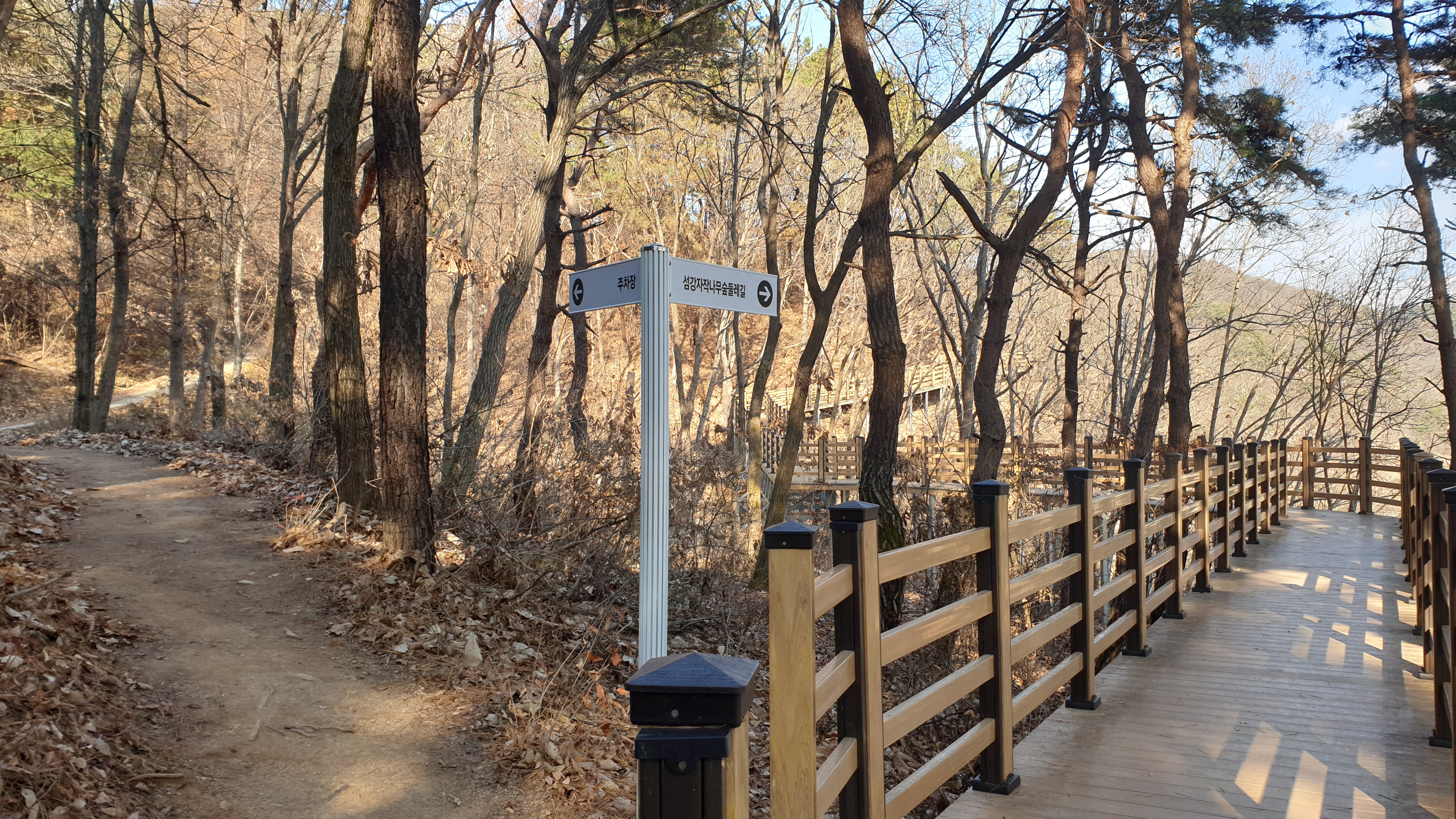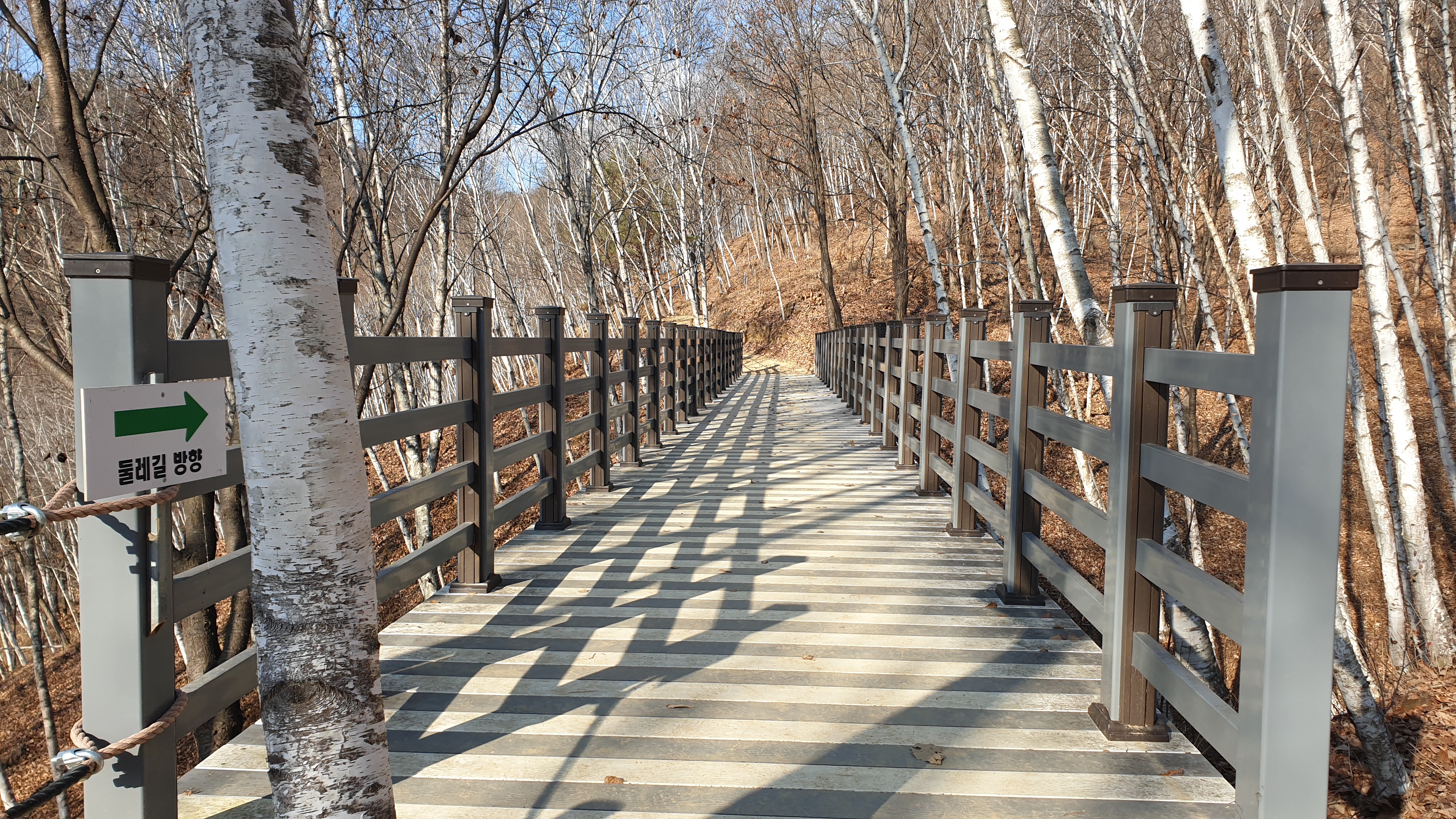 어르신들도 걸을 수 있을 정도로 완만한 길이고 중간에 출구(주차장)로 나올 수 있는 길이 세 곳이 있어 언제든 돌아 올 수 있습니다.