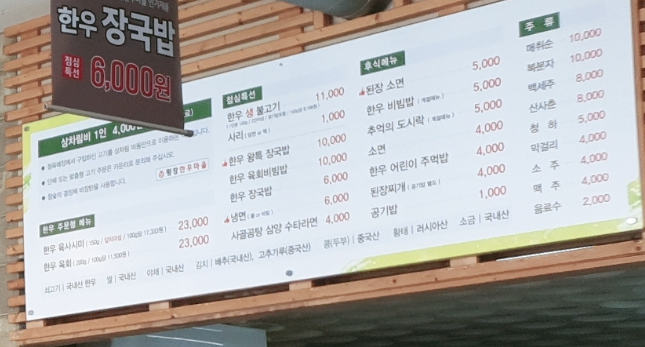 점심 때 간단한 끼니 때우기는 한우장국밥(6,000원)도 저렴하고 괜찮을 거 같습니다.