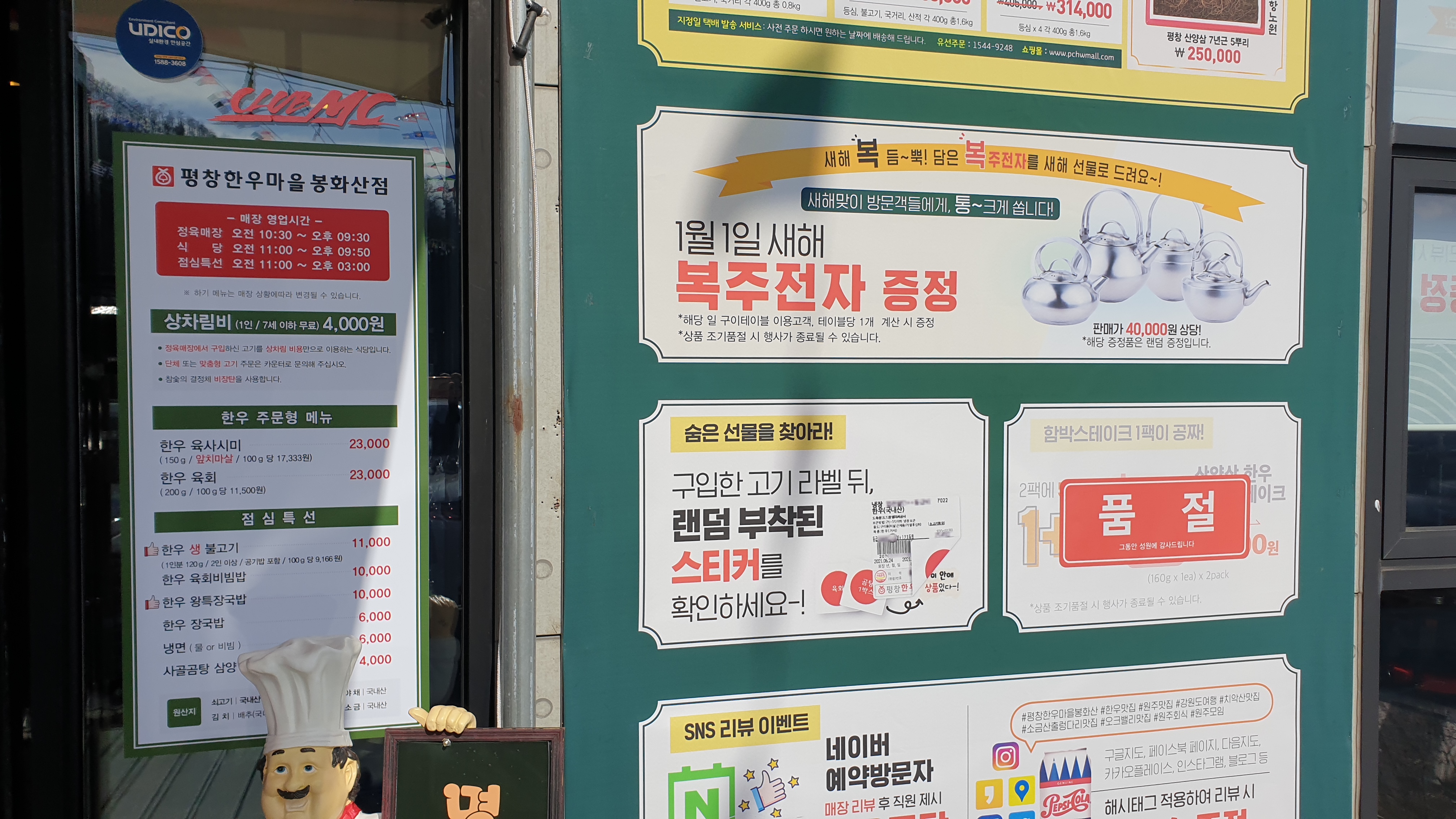 평창한우마을은 정육식당으로 고기는 식당건물과 함께 있는 정육 매장에서 따로 구매할 수 있습니다.