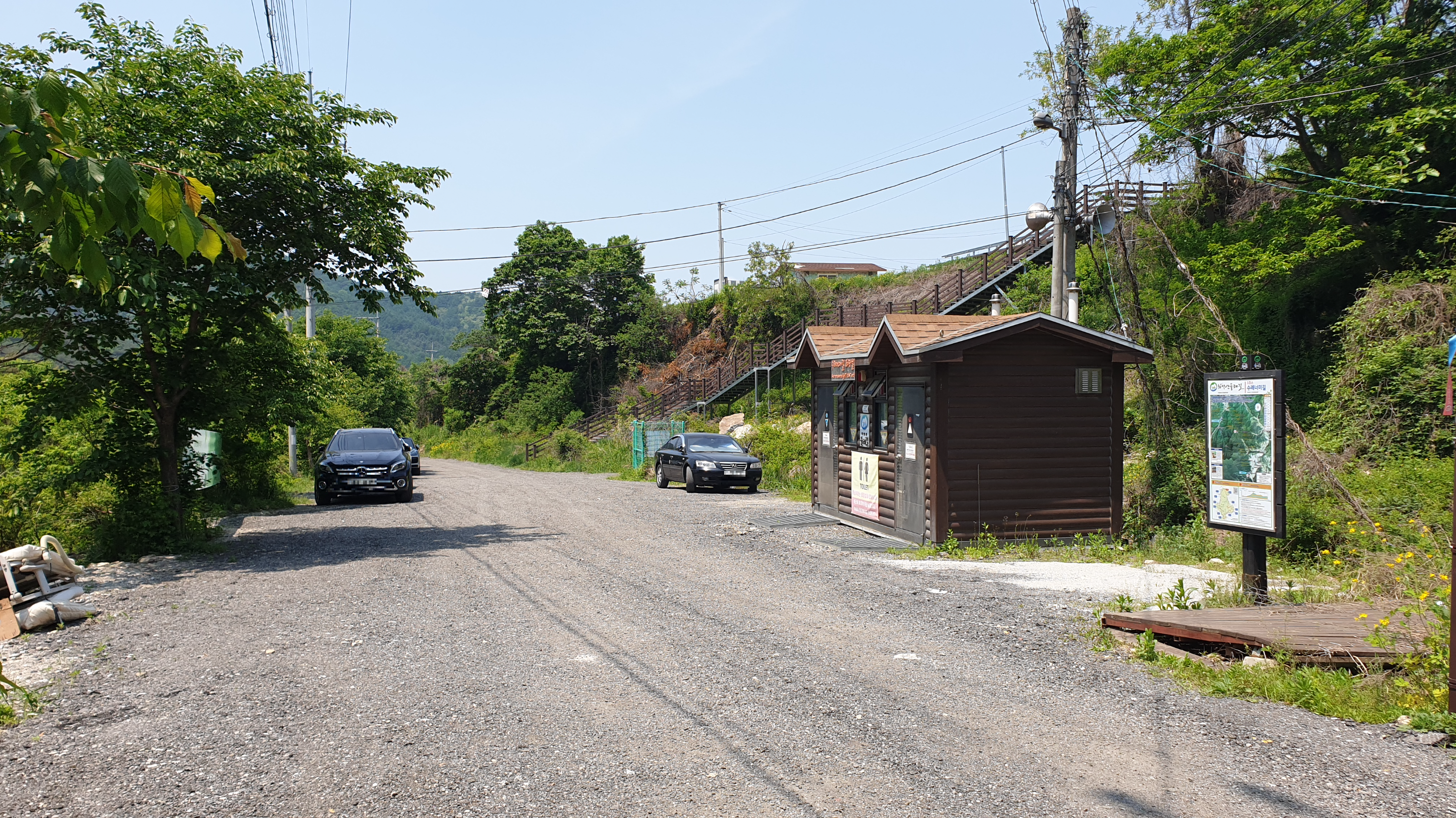 좌측에 화장실이 있고 주차할 수 있는 공간이 나옵니다. 이곳에 차를 세우면 됩니다.