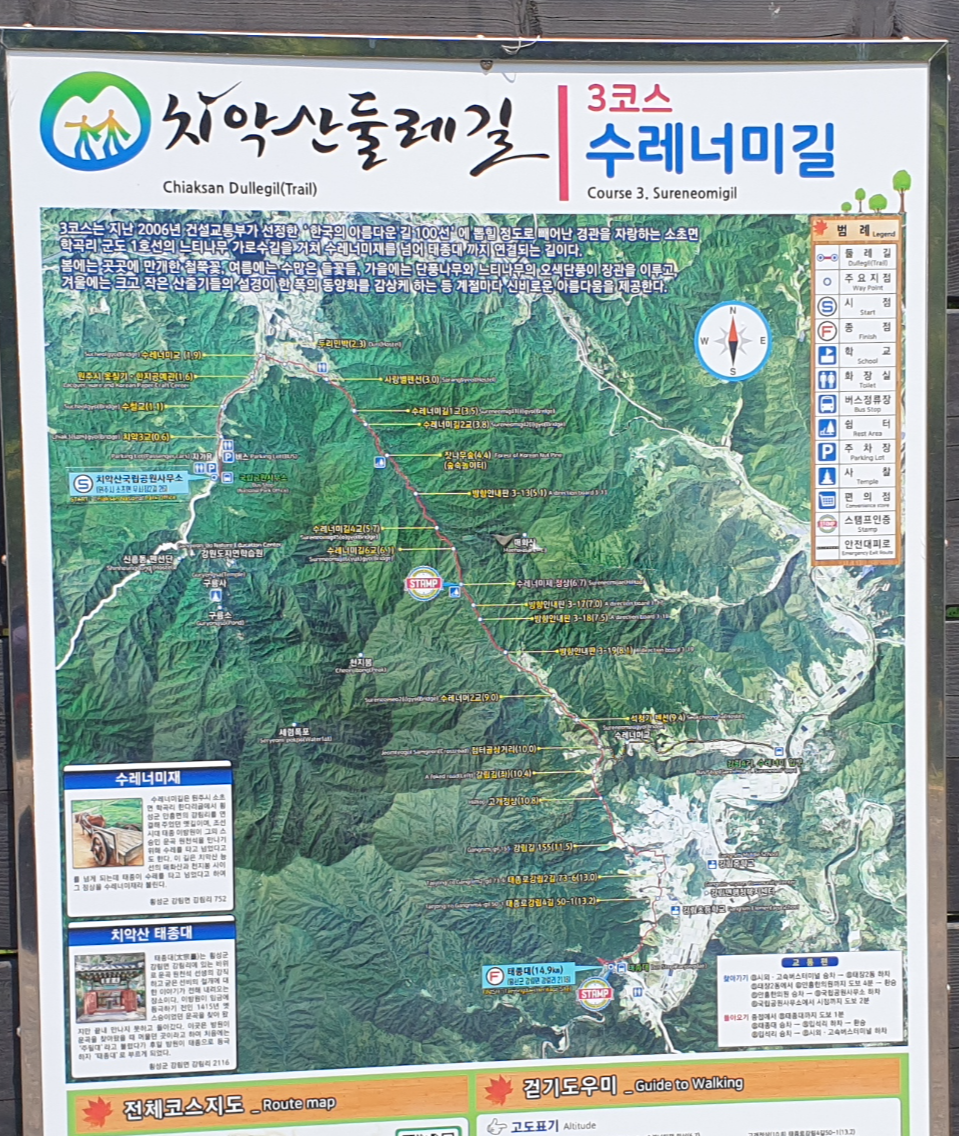 대중교통을 이용해 종주하실 분은 횡성 안흥면 터미널에서 버스를 타고 횡성 강링면(태종대)으로 갔다가 수레너미길을 넘어 원주 소초면으로 넘어오시는 길을 추천드립니다. 횡성 보다는 원주 소초가 시내로 갈 수 있는 교통편이 좀 나은 편입니다.